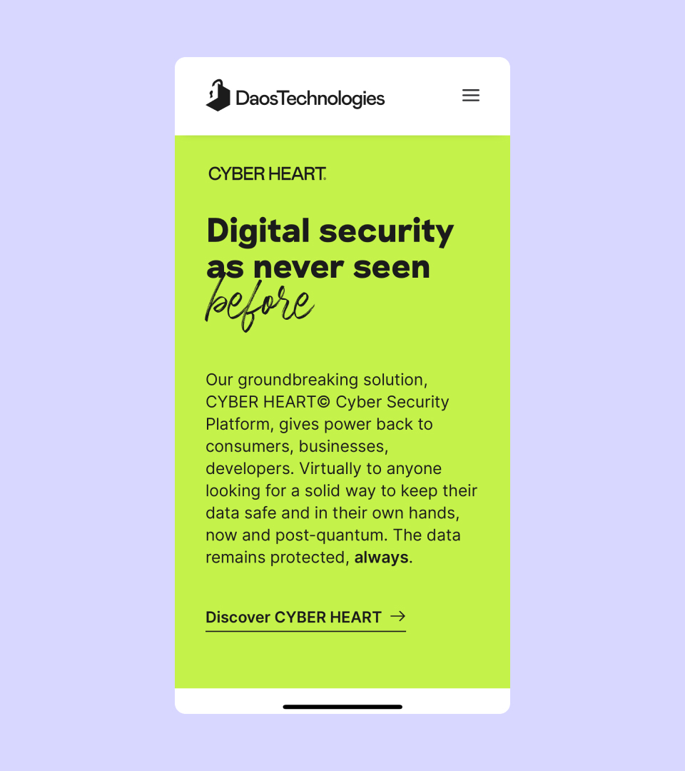 Little toteutti Daos Technologiesille verkkosivuston, joka tekee asiakkaan komplekseista IT- ja SaaS-ratkaisuista ymmärrettäviä ja helposti lähestyttäviä. Tavoitteena oli kirkastaa yrityksen tarjooma, viestiä asiantuntijuudesta omintakeisesti sekä tukea lanseerausta ja myyntiä kansainvälisessä toimintaympäristössä.